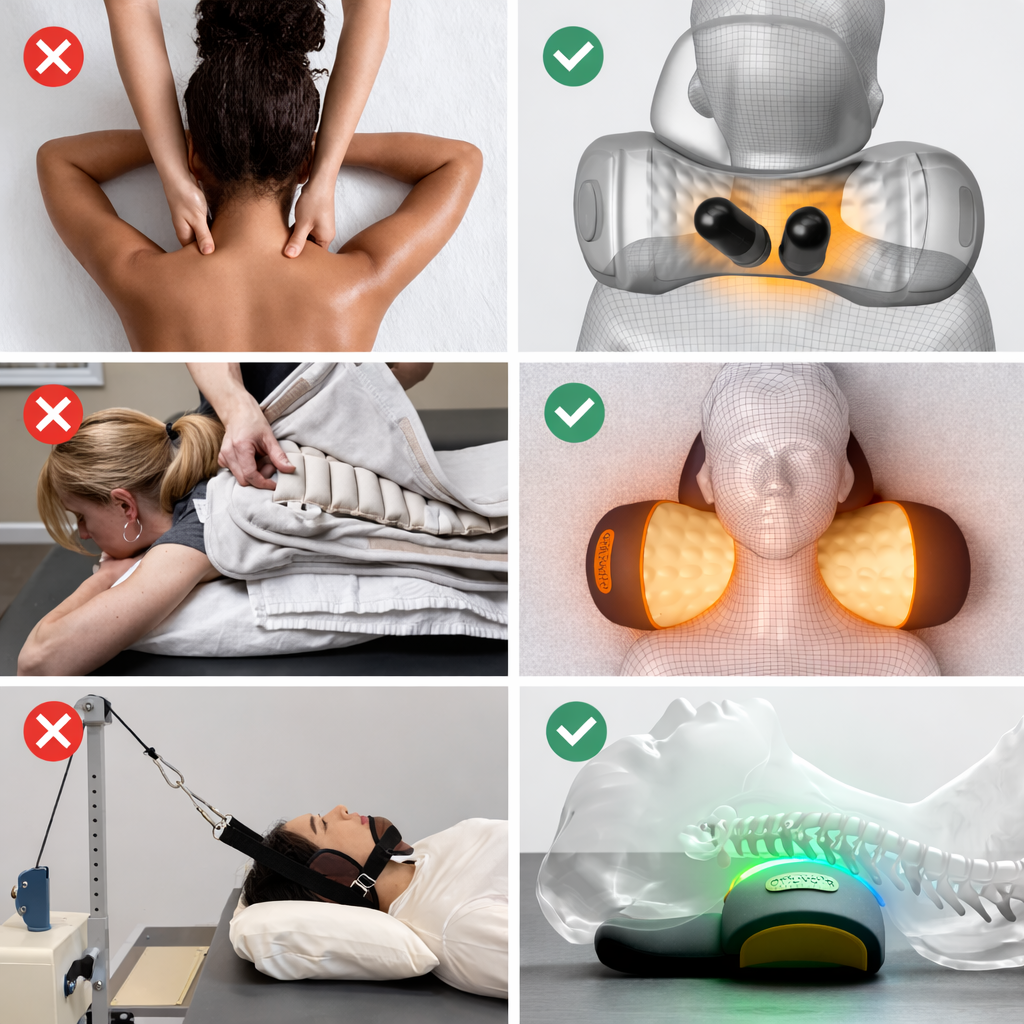 Fisiorest fixes this by combining cervical decompression with deep tissue massage. It gently restores your neck's natural curve while releasing the tension that's been building all day.